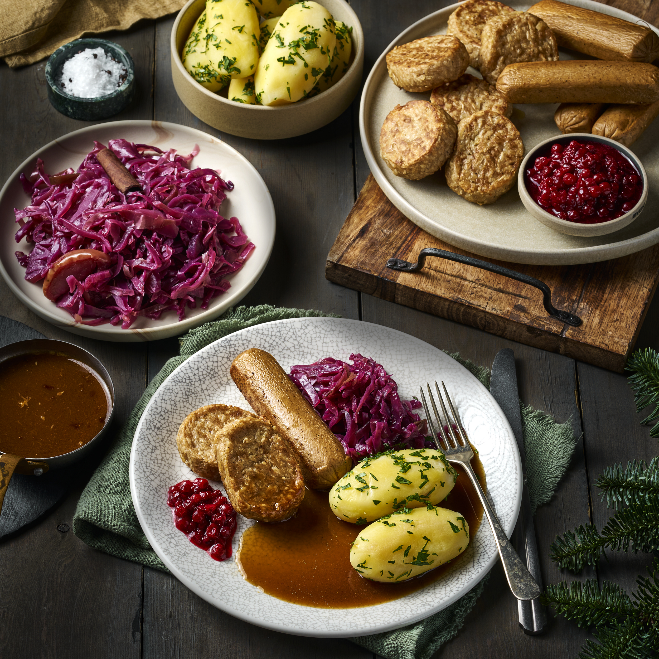 Om du ønsker en smakfull og plantebasert vri på den tradisjonelle julemiddagen, er vår veganske julemiddag et perfekt valg. Her får du klassiske julesmaker i ny drakt – med vår egen veganske julepølse, saftige «vegisterkaker» og hjemmelaget rødkål med julens krydder.
