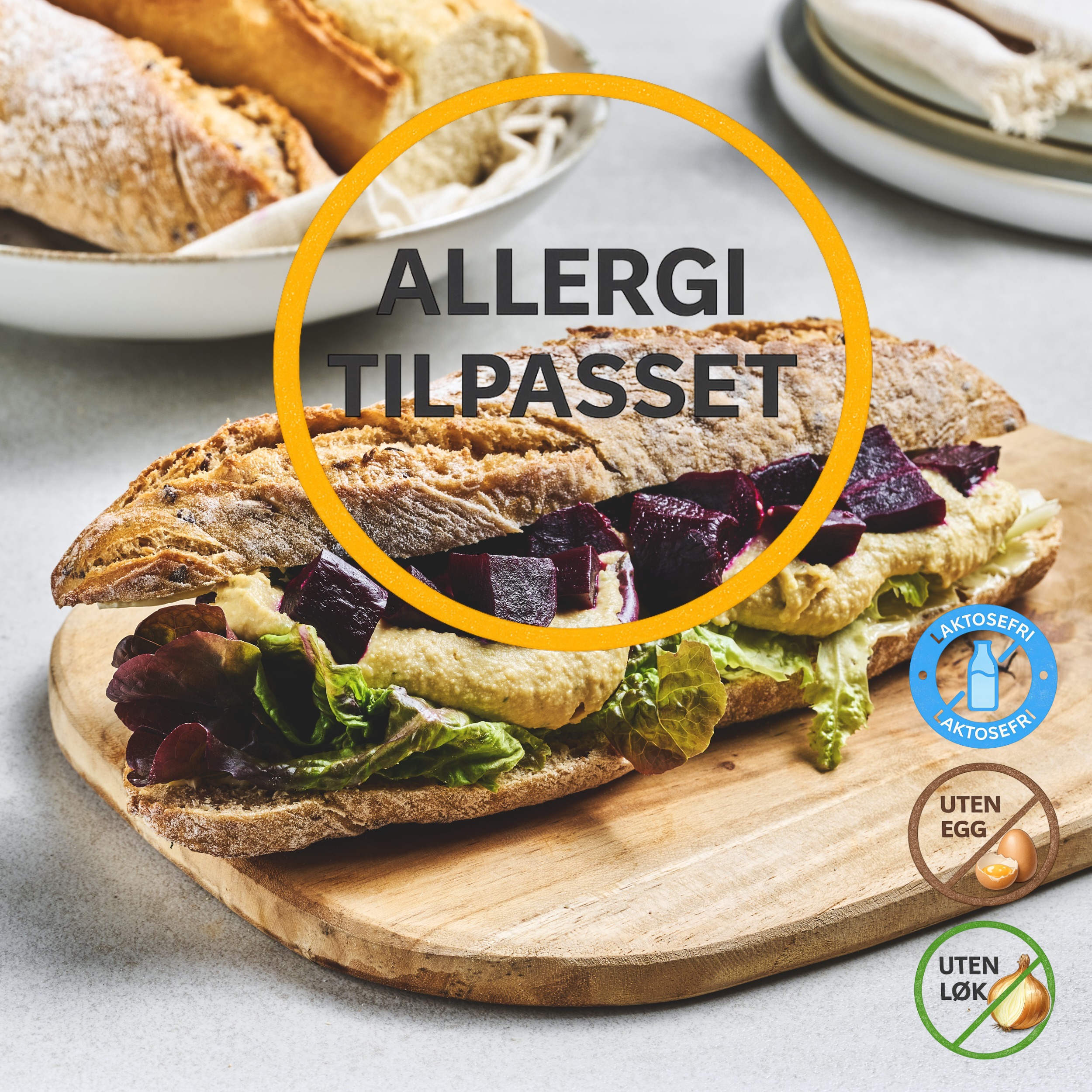 Uten: Løk, melk, egg, soya Fullkornsbaguetten inneholder: Hvete, rug, havre, bygg(gluten), sesam Fyllet inneholder: Hvitløk, sesam, erter, kikerter, koriander, bakte rødbeter, salat og soft flora uten melk og soya