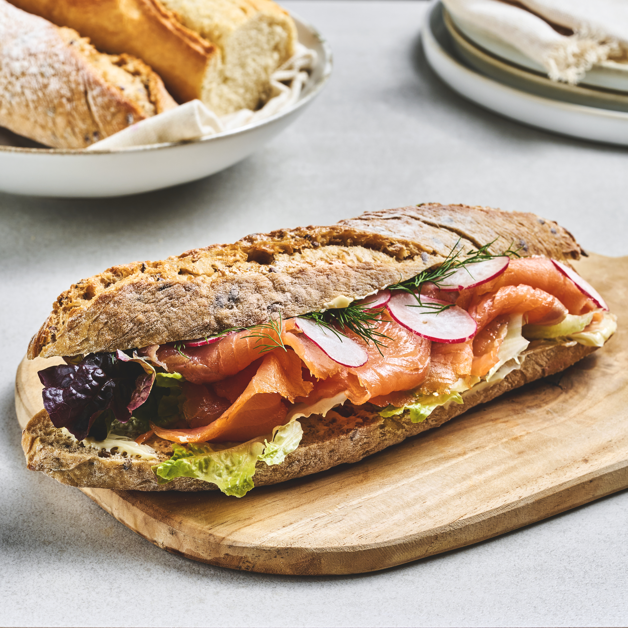 Uten: Løk, hvitløk, melk, egg, soya Fullkornsbaguetten inneholder følgende allergener: Hvete, rug, havre, bygg(gluten), sesam Fyllet inneholder: Fisk, dill, reddik, salat og soft flora uten melk og soya