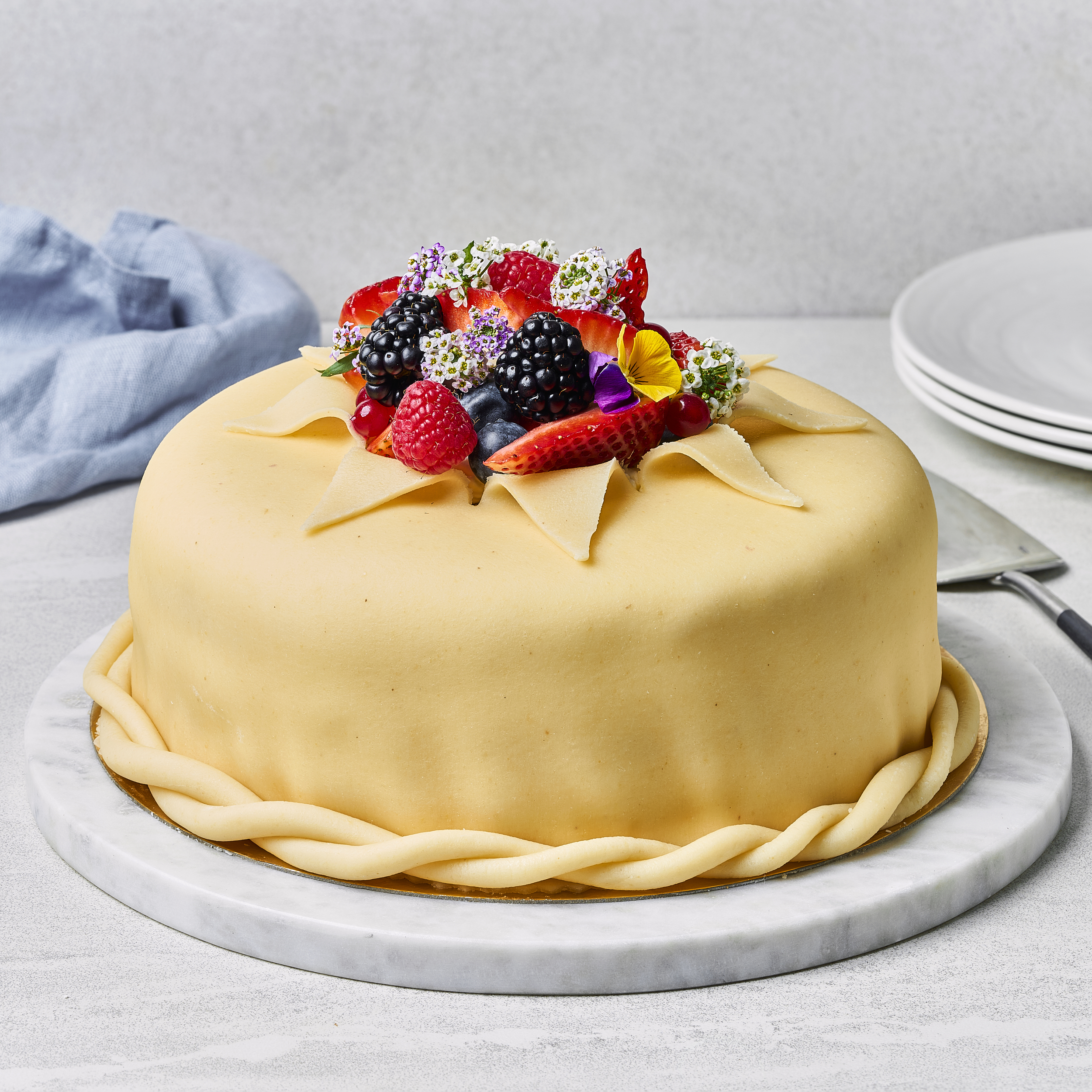 Vår variant er laget med luftig vaniljekrem, bringebær fra Stange, økologiske egg og førsteklasses marsipan