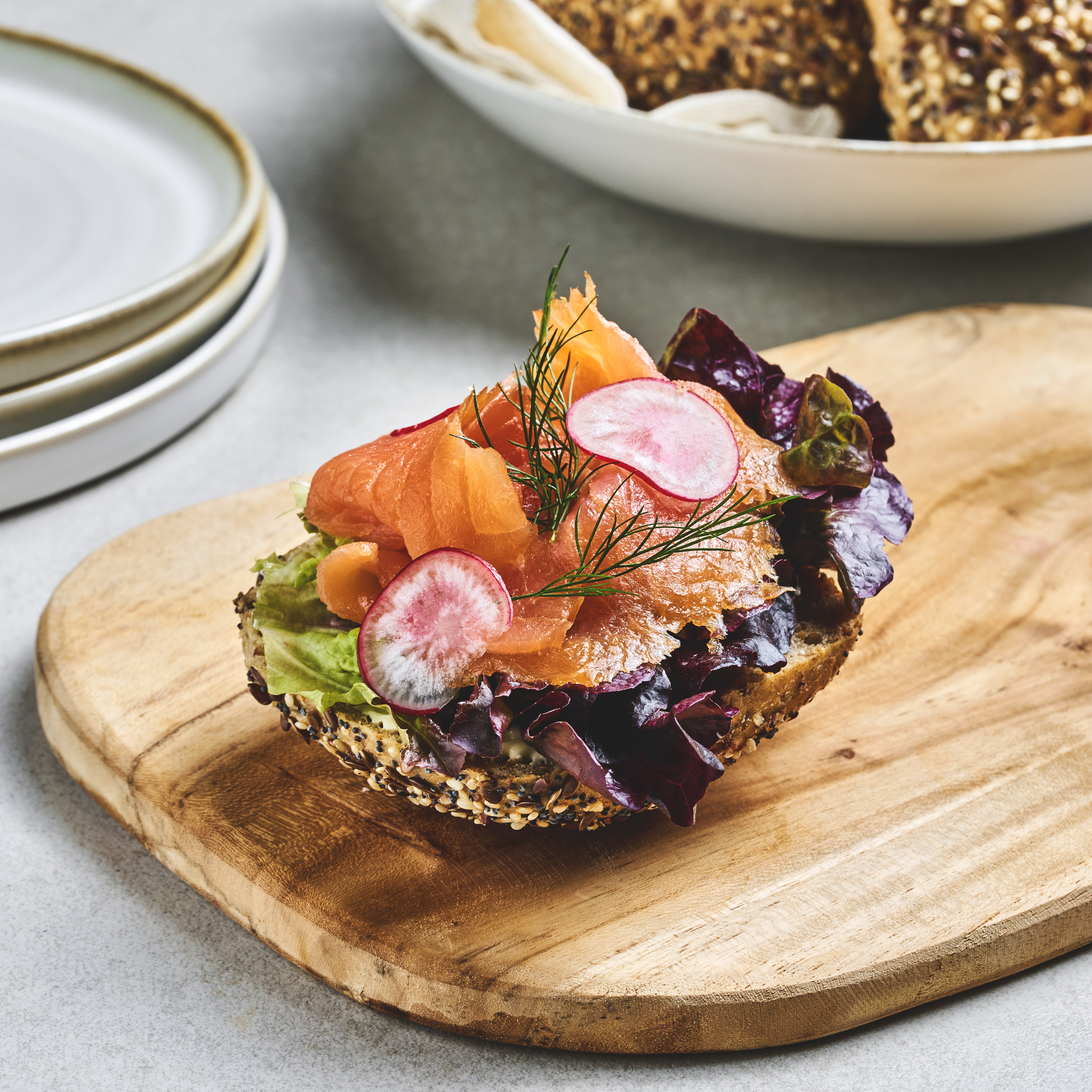 Uten: Melk, egg, løk, hvitløk og sitrus Rundstykke inneholder: Hvete, havre, bygg(gluten), soya, sesam Fyllet inneholder: Fisk, dill, reddik, salat og soft flora uten melk og soya