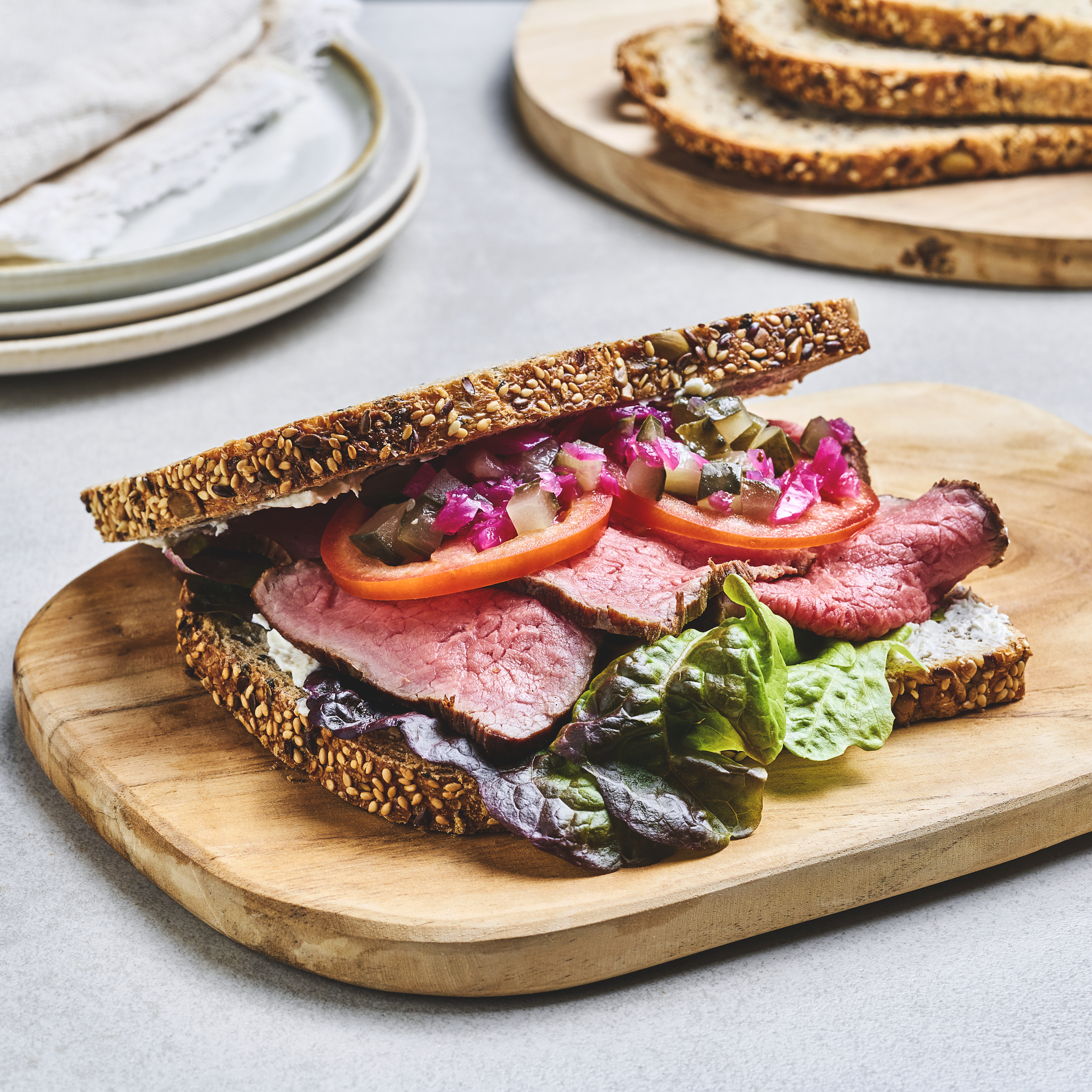 Firkornsbrød-sandwich fra vårt eget bakeri med hjemmelaget roastbiff, pepperrot krem og frisk agurkrelish.
