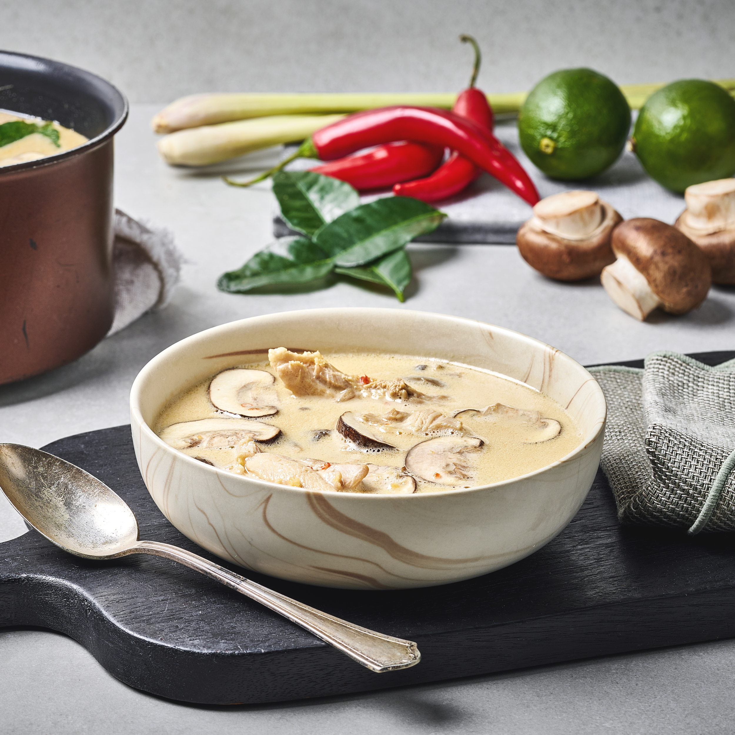 Klassisk thailandsk kokossuppe med kylling og sopp, smaksatt med sitrongress og kaffirlimeblader.